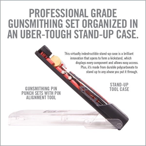 Gunsmithing hammers and punches are core tools needed to modify or disassemble firearms. Most sets available today are generic repurposed hardware sets. Accu-Punch Hammer & Punch sets are designed from the ground up to work better on guns. The hammer features an ergonomic grip and perfectly balanced weight to give both precise controls for tapping tiny pins and optimal force for those that need a little “persuasion”. Our punches are made of hardened steel with nickel plating to resist corrosion as well as hex-shaped handles and rubber O-rings for precise control. Our proprietary Pin Alignment Tool makes aligning and starting tiny pins both easy and accurate. These professional-grade gunsmithing sets are organized in an uber-tough stand-up case.