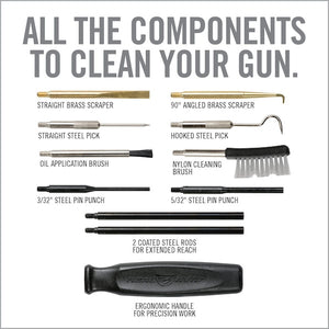 esigned to supplement traditional gun cleaning kits with a professional set of detailing tools. The virtually indestructible stand-up case puts specialized cleaning tools at your fingertips. Tools snap securely into place and stay organized. Remove carbon and gunk from every nook and cranny inside your gun. Professional, specialized and smart. It’s a superior experience for modern shooters.