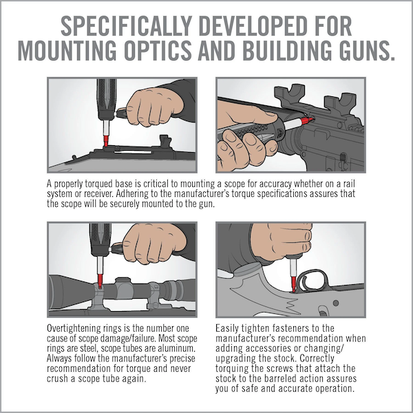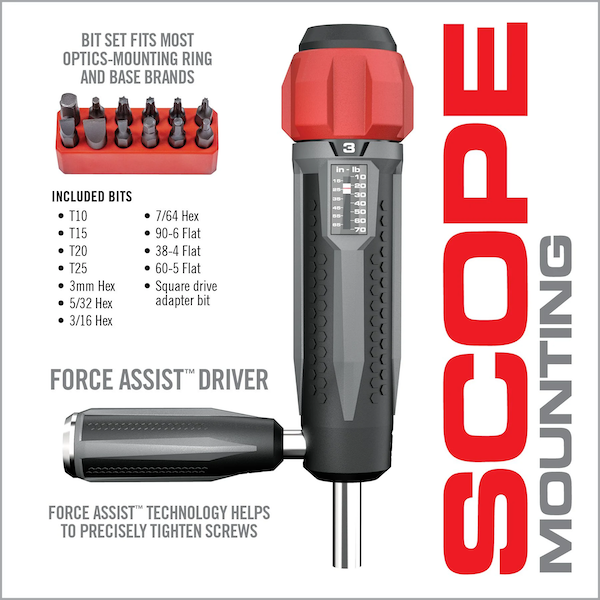The most precise and technically advanced torque driver for guns. Specifically developed for optics mounting and gun builds. Discrete inch-pound increment settings provide spot-on torque adjustments. Comfortable ergonomic grip with Force Assist™ makes tool manipulation a breeze. Functionally intuitive torque setting with visual, tactile, and audible feedback provides confident assurance. To get you started, Smart-Torq® comes with 12 of the most commonly used gun bits. Never over torque a scope ring again!
