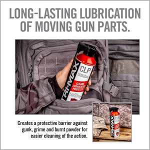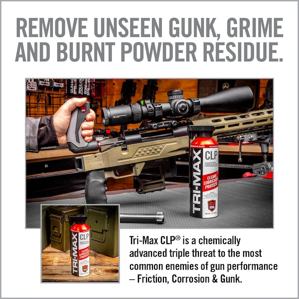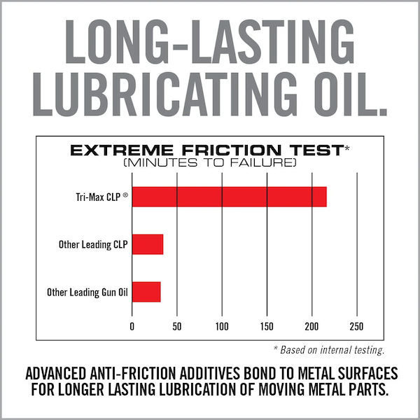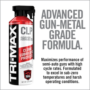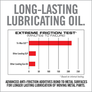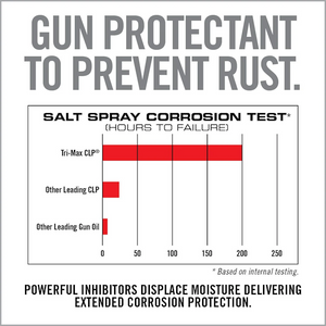 Tri-Max CLP™ advanced formula performs as an effective bore cleaner and solvent on all gun parts. It will tackle grime and burnt powder residue and will help minimize gunk build-up. Tri-Max CLP™ ensures long-lasting lubrication of moving parts to reduce friction and protect from wear. It excels in extreme environments and will work reliably in heat, dust, or arctic cold.