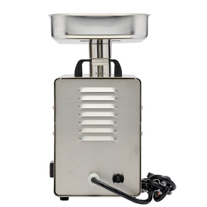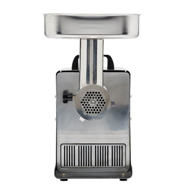 All stainless steel motor housing, all metal gears with roller bearings, heavy duty handle for easy moving, 110 volt, permanently lubricated motor with improved grease formulation to reduce motor noise, built-in circuit breaker, stainless steel knife, head, auger and large meat pan, stainless steel coarse (3/8") and fine (3/16") plates, 3 stuffing tubes (5/8", 1", 1-3/8" OD), and meat stomper.
