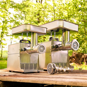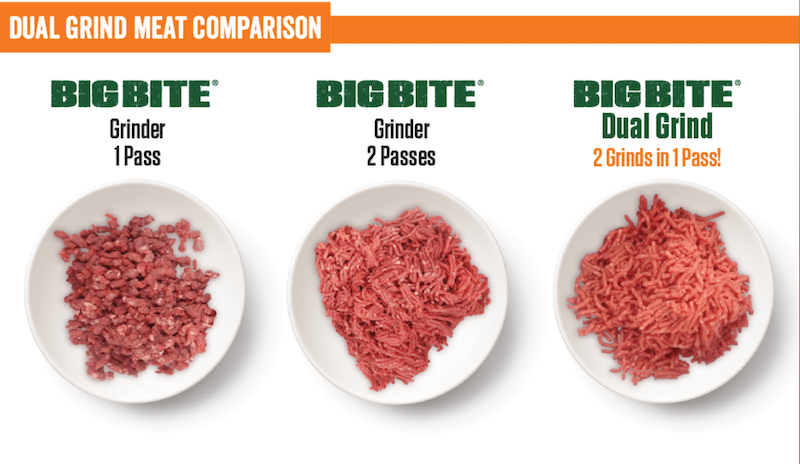 Save time with two grinds in one pass! Our New Dual Grind Meat Grinder can cycle through two grinds in a single pass. No more reloading for a second grind. This innovative technology has been used in commercial processing for years, and now we are bringing it to the home processing world! The secret is in the innovative design incorporating a unique double-edged knife and two grinder plates. The result is the quality and consistency of two separate grinds in just one pass. Combined with the Big Bite technology that allows the auger to take an extra big bite of meat and then move it through the grinder quicker than other grinders, you will get a premium grind in half the time!