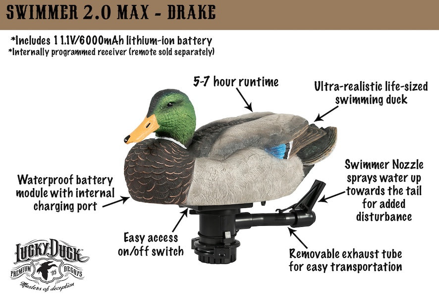The Lucky HDi Super Swimmer 2.0 - MAX Series is the most versatile and natural swimming decoy on the market. The Lucky HDi Super Swimmer 2.0 MAX features an ultra-detailed and realistic duck body that simulates a relaxed swimming mallard. A high output jet propulsion system creates natural swimming movement just as a duck does on its own and has a removable exhaust tube for easy transportation. Included on the MAX series is a Lucky Duck Decoy Follower, which attaches to the included pump screen and pulls 2 static floaters in a staggered layout. Giving you the most realistic 3 decoy movement possible. Also included is a Lucky Duck Swimmer Nozzle. This attaches to the back of the jet propulsion system and sprays water up towards the tail as the swimmer is in motion,creating a true water disturbance. Completed with a larger 12V Lithium-ion battery, the Swimmer 2.0 MAX will run for 5-7 hours. Designed with the hunter in mind, we added an easy access on/off switch that can be operated with even the bulkiest of gloves. The lithium battery is housed within a sealed module, so there is no concern over water getting into those tight places. Stale, calm, and windless spreads, add a few Swimmer 2.0 MAX and watch as the water comes alive. Available in Mallard Drake, Mallard Hen, and Pintail Drake.